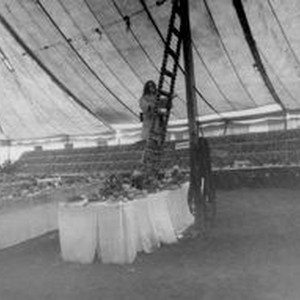 Photo--black and white, from Borba 8" x 10" celluloid negative: Gravenstein Apple Show display is front view of girl mannequin on ladder, both made of whole and dried apples. Sign on girl's back states "Miss Sebastopol."Sign on apply display behind ladder "Spring Hill."