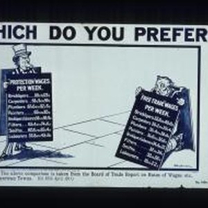 Which do you prefer? Protection wages per week: Bricklayers, 110s to 125 s; Carpenters, 68s9d to 90s ... Free trade wages per week: Bricklayers, 37s6d to 40s6d; Carpenters, 36s2d to 39s4d ... The above comparison is taken from the Board of Trade report on Rates of Wages, etc., in American towns. (Cd. 5609, April, 1911)