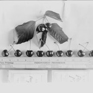 Identification of Luther Burbank cherry hybrid from the Gold Ridge Experiment Farm--row of nine cherries (M-10 tree 31) under a cluster of two cherries and leaves with ruler, 1927