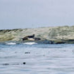 Bruce Mate swimming towards two seal bulls lying on Simpson Reef.