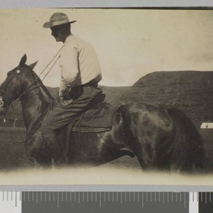 A man in a hat rides on horseback. Open land, a rooftop, and hills in the background. Title and date devised by cataloger. Location is unknown. Man's face is in shadow.