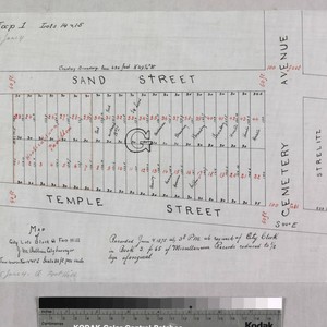 Sand to Temple St., west from Cemetery Ave., with lot owners; red, black ink with color highlighting. . Alt title supplied by cataloger.