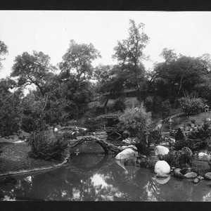 View of the stone bridge and wooden structures at the north end of the Japanese garden, soon after it was built. The label that accompanies this photo in the album reads "No. 107 North section of Japanese garden, about 1913."