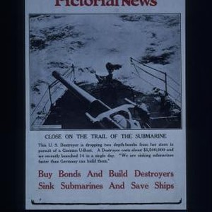 Close on the trail of a submarine. This U.S. destroyer is dropping two depth-bombs from her stern in pursuit of a German U-boat. A destroyer costs about $1,500,000 and we recently launched 14 in a single day. We are sinking submarines faster than Germany can build them. Buy bonds and build destroyers. Sink submarines and save ships