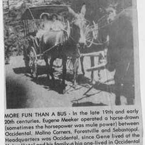Photo--black and white, newspaper clipping: 1979 newspaper clipping from The Sebastopol Times newspaper with picture of two girls in mule drawn buggy in the Occidental area. The caption explains the Eugene Meeker operated and horse or mule drawn buggy between Occidental, Molino Corners, Forest ville and Sebastopol in the late 1890s and early 1900s. Eugene Meeker lived in the Union Hotel in Occidental. Photo from collection of Ralph Sturgeon.