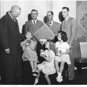 Sebastopol Apple Blossom Princesses Merideth Shelton, two unidentified young women and Sebastopol businessmen Curt Stange (Bank of Sonoma County) and Harry Martin (Martin's Nursery and Ed Herring (Best & Feaks Insurance) meet with representatives from California Governor Earl Warren at the California State Capitol in Sacramento