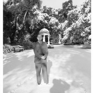 Irwin Morrkisch poses on a lawn ringed by trees after a rare southern California snowfall. Behind him there are several benches and a small stone gazebo housing a marble statue. MS notes on verso read "Huntington grounds: snow scene, Jan. 1 [sic], 1948" and "(Irwin Morrkisch)". Date should read January 11, 1949.