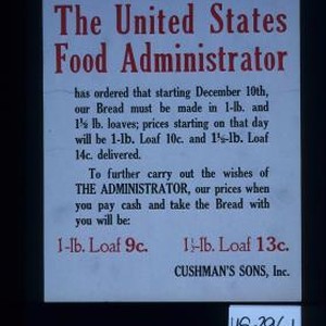 The United States Food Administrator has ordered that starting December 10th, our bread must be made in 1-lb. and 1 1/2 lb. loaves; prices starting on that day will be 1-lb. loaf 10c and 1 1/2 lb. loaf 14c delivered ... Cushman's Sons, Inc