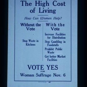 The high cost of living. How can women help? Without the vote - stop waste in kitchens. With the vote - increase facilities for distribution, stop gambling in foodstuffs, prohibit public waste, get better market facilities. Vote yes for woman suffrage Nov. 6