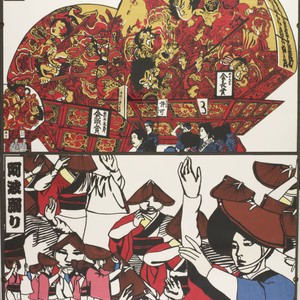 One of four panels of a polyptych print of a procession with carriages, dancers, and costumes.