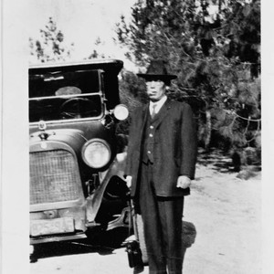 Chiyozo Goto (born Japan 1870 - died Japan ?) stands next to an automobile, wearing a dark three-piece suit and a hat, and smoking a cigarette. After working for the Marsh Japanese garden in Pasadena, Mr. Goto and his family came to the Huntington with the Japanese house after Henry E. Huntington purchased it in 1911. The first gardener for the Japanese garden, he and his family lived in a smaller house behind the Japanese house. On verso: Mr. Goto's old views.