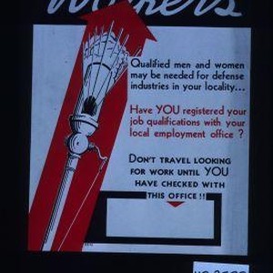 Workers. Qualified men and women may be needed for defense industries in your locality ... Have YOU registered your job qualifications with your local employment office? Don't travel looking for work until YOU have checked with this office!!