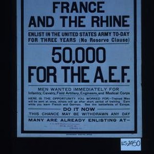 Here is your chance to see France and the Rhine. Enlist in the United States Army to-day for three years (no reserve clause). 50,000 for the A.E.F. Men wanted immediately for ... Here is the opportunity you worked for. Trained men will be sent at once, others will go after short period of training. Earn while you learn French and German. See the battlefields of Europe. Do it now