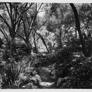 View of a foot path through a wooded section of the Japanese garden. The label that accompanies this photo in the album reads "No. 21 South section of Japanese garden, about 1916."