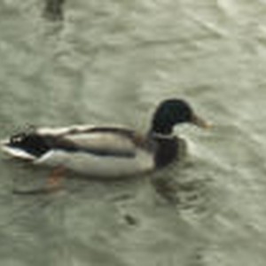 Male duck with a yellow bill and green head swimming in water at Illinois Beach State Park.