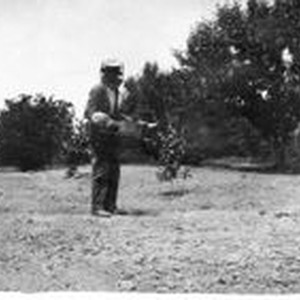 Photo, black and white: Oscar Hallberg with bee smoker. Circa 1925.
