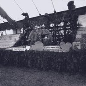 Photo--black and white: Gravenstein Apple Show display by Forestville with large pumpkin made of Gravenstein apples and a sign "Peter Peter Pumpkin Eater." G.S. Mascagni Company of Sebastopol. Display is of "Fancy Big Hit Brand" Gravenstein apples is seen to the right. To the left a display by the Apple Growers Co-op Association, California Fruit Exchange. Circa 1930's.