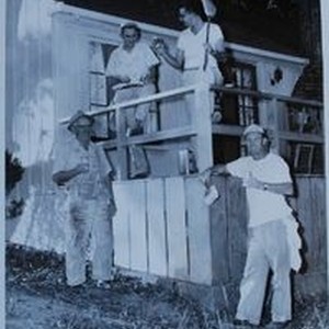 Photo--black and white: Sebastopol Lions Club scrapbook photo: Group of Lions Club men painting a house. L-R: Dick Dickenson, Ed Herring, Phil Wetch and John Fore. Circa 1955.