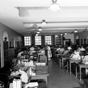 View of the Ahmanson reading room, full of readers. The large elevated desk which the man is standing next to is where library staff distributed requested materials from the rare book stacks immediately behind them and the manuscripts stacks as well.