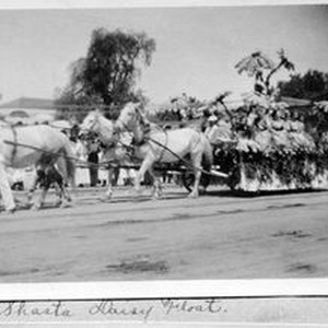 Photo--black and white: Santa Rosa Carnival Parade, May,1910. The Shasta Daisy float pulled by white horses.