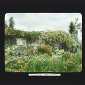 Glass photographs -many in color- of Southern California scenes. They include Pasadena views (homes, a school, a church), Mt. Lowe, poppy fields, sunset over the Pacific, San Gabriel Mission, Catalina Island, Los Angeles (Eastlake Park), hauling cotton in Imperial Valley, San Luis Rey arches, headwaters of Owens River.