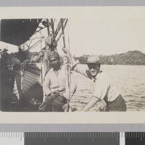 Martin Johnson stands with sailor on deck of the Snark. Title and date transcribed from envelope. Ship is possibly the Snark, as Johnson was a crew member on this voyage with London.
