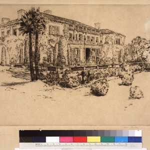 An etching of the southern and western façades and the south terrace of the Huntington residence, with topiaries on the lawn and terrace and vines growing on the residence.