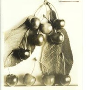Photo--black and white: Identification of Luther Burbank cherry hybrid from the Gold Ridge Experiment Farm. Cherry cluster with single cherries. Identified on back "I-33 probably same as 1909 Fine."