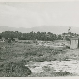 A photograph of the campus as it appeared after the Marines left, but before much construction had taken place. The Marine water tower is seen in the distance, and a car is parked on the road.