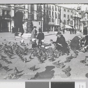Men, women, and children stand and kneel to feed pigeons in Piazza San Marco, Venice. Front of St. Mark's Basilica is seen in background. Title and date transcribed from envelope. Copy print of original.