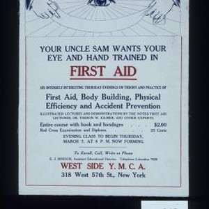 Your Uncle Sam wants your eye and hand trained in first aid. Six intensely interesting Thursday evenings on theory and practice of first aid, body building ... West Side Y.M.C.A., 318 West 57th St., New York