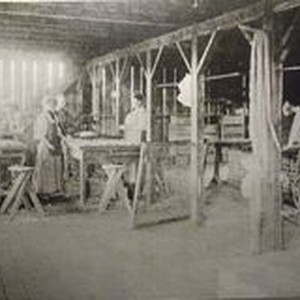 Photo--Black and white, mounted: A group of men and women at work at the Andy Frei Apple dryer in 1909 Sebastopol/Graton. The woman on the far left is Lena Heintz (identified by John Heintz) The man operating the peeler on the right is Errol Singmaster.The equipment to the left that the women are working with are apple peelers and Singmaster is working with an apple slicer. Caption on verso by Ralph Sturgeon: "John Heintz upon viewing this photo said he believes that to be his mother in the rear and to the left of this apple drier (Lena Heintz). Note men at hand peelers. The ladies trimmed & lay them in slices on trays. These trays went into sulphur box for a time, removed and into other slots for drying. The sulphur smoke in hay-wire driers were an industrial hazard--(depending on the way of the wind or drafts in the structure). Mrs Grandmother Lena Wright and my mother's bronchial tubes were damaged as they worked in these or this type of apple drier, Occidental area for years. Many other(s) were so effected. It was especially noticed when they came down with a cold. How well I remember." Photo identified by Ralph Sturgeon as "MISC-24."