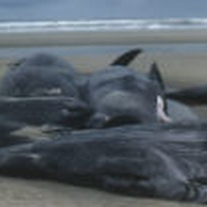 The venter and genital openings of a male whale lying on the beach.