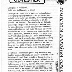 Bilten Kristove pentekostalne crkve u Ljubljani. Broj iz rujna 1988. godine koji sadrži kratak uvodnik, a zatim izvješća o tome što se događalo u crkvi tijekom ljeta i obavijesti o tome što će se događati u crkvi tijekom rujna i listopada. [Description (original non-English/roman language/script)] Bulletin of the Christ's Pentecostal Church in Ljubljana for September 1988, containing an editorial, report on what went on in the church during summer and the notices what will be been happening in the church in September and October. [Description English/roman)]