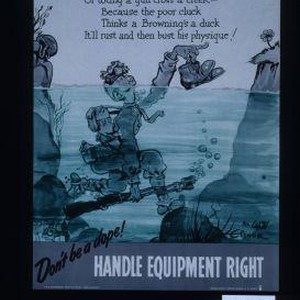 Joe Dope has a way that's unique/ Of toting a gun 'cross a creek/ Because the poor cluck/ Thinks a Browning's a duck/ It'll rust and then bust his physique! Don't be a dope! Handle equipment right