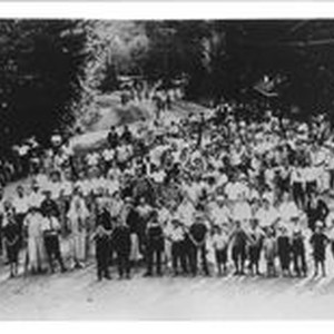 Photo, black and white: Large group of people "waiting for the train" circa 1920s at a Russian River resort area. Vintage cars and depot station to the right. People standing on Northwestern Pacific railroad track to pose for picture.