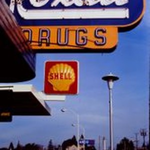 Slide, Kodachrome color: The Analy Pharmacy Rexall Drug Store sign, (at approximately 186 North Main Street nearest cross street Wilton Avenue) in Sebastopol. February, 1977