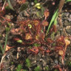 A close-up of roundleaf sundew growing on moist ground alongside various small grasses.