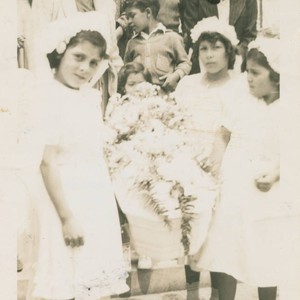 Funeral service for infant Gomez (first name unknown) held at Our Lady of Solitude Catholic Church. Four pallbearers, Margaret Mercado (left), an unidentified girl (center, behind casket), Evangelina Rivera and Hortencia Mercado (right), all dressed in white dresses and three wearing veils, carry the flower-topped casket down the church steps to the sidewalk followed by two adults and several children.