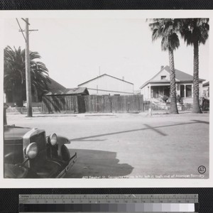 View of houses, a fence, and palm trees on Bauchet Street near Old Chinatown in Los Angeles, with a building of the American Foundry visible behind the fence. Title transcribed from photograph. "42" stamped in ink in the lower right corner.