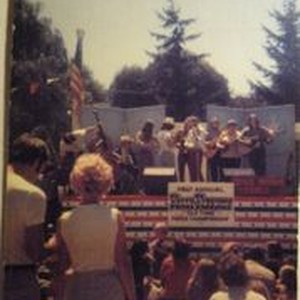 Photo--color, mounted: A bandstand at Ives Park in Sebastopol with an audience in front and nine musicians on stage. A sign on the front of the stage states: "First Annual Kelly Kirksey Old Time Fiddle Championship."