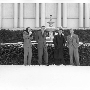 A group of four men in suits stand in front of the fountain on the south side of the library building after a rare southern California snowfall. The man on the far left has a scarf wrapped around his head and holds a snowball in front of his mouth. The man second from the right is wearing a black coat and gray hat, and has snow piled on his shoulders and the top of his hat. MS notes on verso read "Huntington Grounds ; snow scene, Jan. 11, 1948" and "1. Graydon Spalding ; 2. William Parish ; John Moslander ; 4. Carey Bliss". Date should read January 11, 1949.