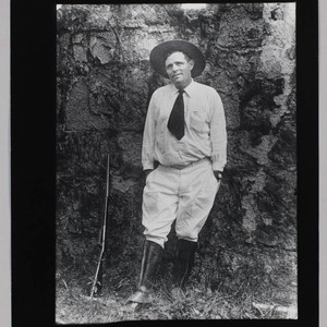 Jack London leans against a stone wall with his hands in his pockets and a rifle propped against the wall to his right. London wears light colored shirt and pants, a dark tie, a broad-brimmed hat, and dark gaiters over his lower legs. Title devised by cataloger, date and location based on another sepia-toned print that is in JLP 538 LA 7 (p. 61). There is also a negative copy.