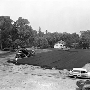 Pavement is being laid and flattened in the public parking lot for the San Marino ranch. A slightly different version in the same folder has an MS note on verso that reads "August 14 1952."