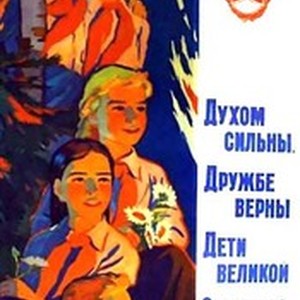 Soviet social poster. Captions read, "Духом сильны, дружбе верны дети великой советской страны / Dukhom sil'ny, druzhbe verny deti velikoi sovetskoi strany", meaning, "Strong in spirit, faithful in friendship are children of the great soviet country". [Description English/roman)]