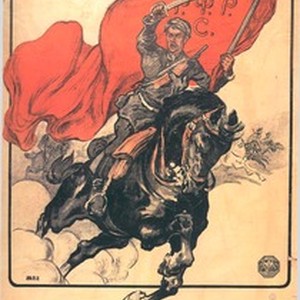 A poster from the Russian civil war era (1918-1923). Captions read, "Na konia, proletarii! Rabochaia revoliutsiia dolzhna sozdat' mogushchestvennuiu krasnuiu konnitsu. Kommunist dolzhen stat' kavaleristom / На коня, пролетарий! Рабочая революция должна создать могущественную красную конницу. Коммунист должен стать кавалеристом", meaning, "Proletarian, get on horse! The workers' revolution must be able to create a mighty cavalry. Every communist must become a cavalryman". [Description English/roman)]