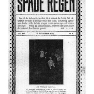 Dutch Pentecostal journal, published monthly. The title is a Biblical reference to the post-1880 movement, a precursor to modern Pentecostalism mirroring the "early rain" at the time of Moses. Subtitled: "Maandblad, gewijd aan de belangen van Gods koninkrijk" [Magazine, dedicated to the interests of God's kingdom]. First published in April 1908. [Description English/roman)]