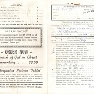 Order Form (Woodlawn Park Church of God in Christ) requesting Sunday School Literature from D.J. Young Publishing Company, 1970 July 14. [Description English/roman)]