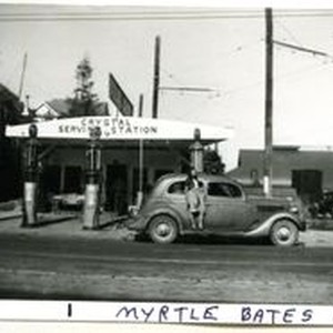 Photo: The Crystal Service Station on North Main Street, Sebastopol. Four gas pumps out front. An automobile is parked in front with Myrtle Bates standing on the running board. On the roof of the station is a Beacon sign. In the right background is the roof of the Sebastopol Apple Growers Union packing house. 1942