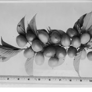Photo, black and white: Plum cluster on branch ruler at bottom. Caption: Cranberry Plum K-39 (Entire Tree)." Photographed 1928.